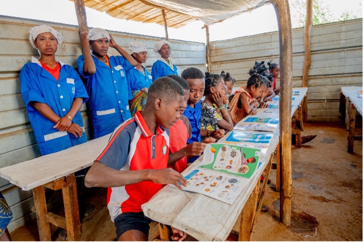 Chaque jour, les cuisinières – majoritairement des mères d’élèves – préparent des repas nutritifs en suivant les recettes du catalogue de menus de l’Office National de Nutrition (ONN), élaboré avec l’appui du PAM. Elles disposent également d’un fonds en cash pour acheter des produits frais comme la viande, le poisson, les fruits et les légumes.